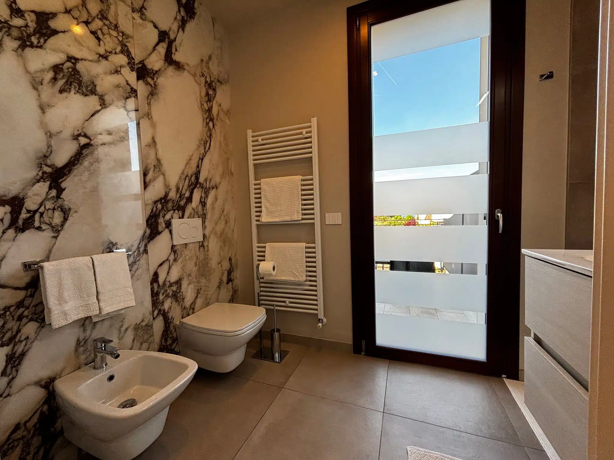 The French door is soundproofed and has mirrored glass in order to give the customer complete privacy, during the night there is the possibility to close the outer sashes as well.